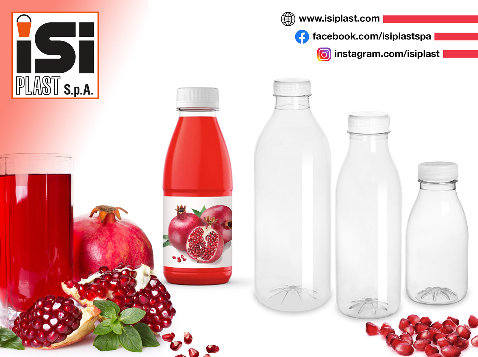 ISI Plast avec sa ligne de bouteilles favorise les livraisons à toute activités du secteur food, en favorisant la consommation du jus de grenade qui contribue à la beauté exterieure et à la snaté interieure de notre organisme.