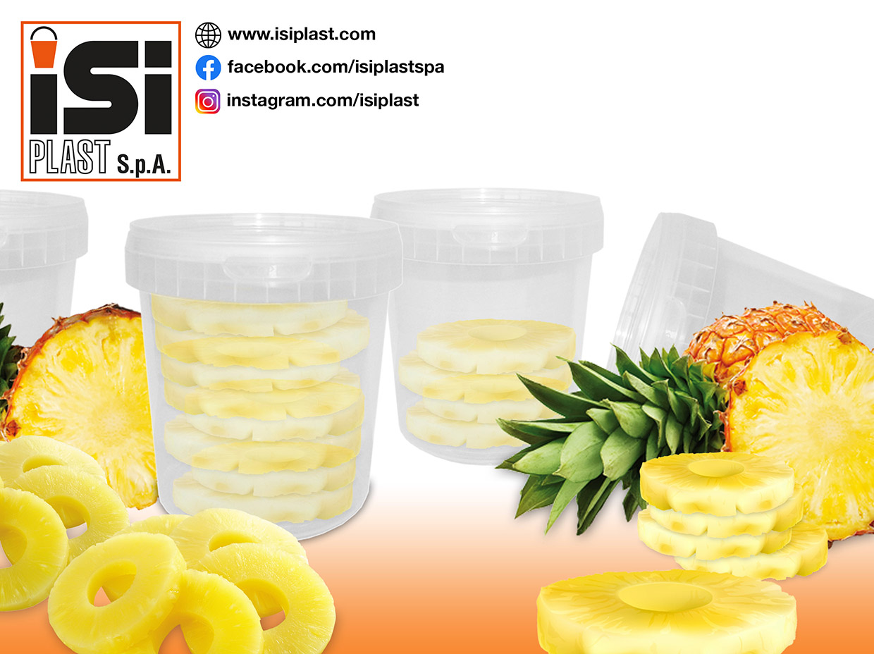 Le modèle MU 1004 de ISI Plast est la meilleure solution pour repondre à cette exigence, realisé dans le complet respect des reglements du secteur alimentaire, le couvercle avec scellage et l’epaisseur des parois donnent au packaging les moyennes adaptes au gerbage des rondelles d’Ananas.